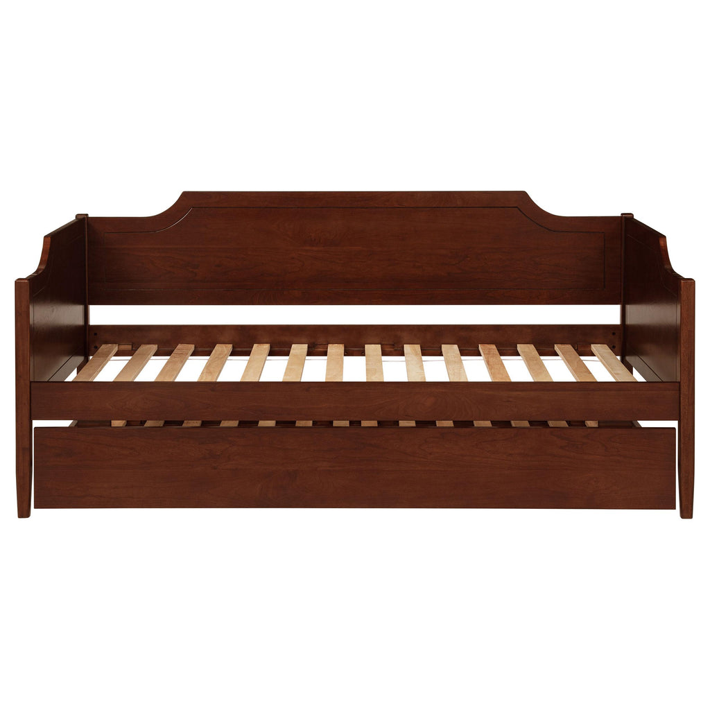 This modern classic-style daybed with trundle merges timeless elegance with practical design. The camelback silhouette and refined panel detailing add sophistication, while its construction from rubberwood, plywood, MDF, and cherry veneer ensures durability. The rich cherry finish highlights the natural wood grain, enhancing its classic appeal. Included slats provide reliable mattress support, and the smooth-gliding trundle with four wheels offers convenient additional sleeping space. Key Features: • Modern classic daybed and trundle with a camelback silhouette and panel detailing • Cherry finish emphasizes the natural wood grain for a polished, refined look • Durable construction from rubberwood, plywood, engineered wood, and cherry veneer • Smooth-gliding trundle fitted with four wheels for easy access to extra sleeping space • Included slats provide stable mattress support and airflow, eliminating the need for a foundation • Combines traditional elegance with functional, space-saving versatility