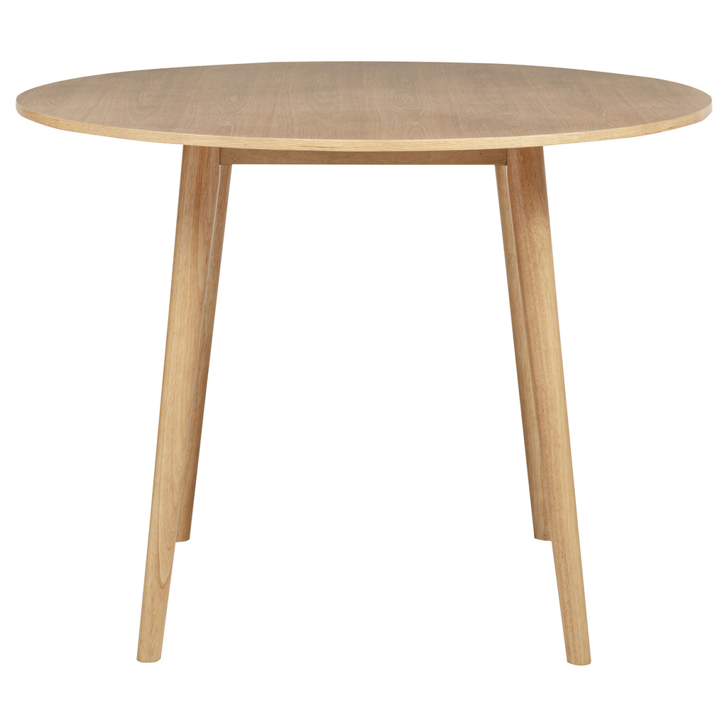 Elevated with charm and simplicity, this round counter height table brings mid-century warmth to casual dining. Its smooth circular top rests on tapered legs, offering a sculptural silhouette that feels both light and grounded. Crafted from solid rubberwood with ash veneer over engineered wood, the natural grain glows beneath a light ash finish. Perfect for kitchen islands, dining nooks, or relaxed gathering spaces. Key Features: • Round counter height dining table in light ash finish blends modern shape with classic warmth • Smooth tabletop offers a raised surface for casual meals, drinks, or entertaining guests • Tapered legs add sculptural simplicity while supporting the elevated round profile • Ideal for compact dining areas, breakfast corners, or casual kitchen bar settings • Crafted from solid rubberwood, ash veneer, and engineered wood for strength and style • Light ash wood grain finish pairs easily with matching stools or complementary seating