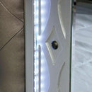 MANAR Cal.King Bed, 90 1/4"L X 79"W X 62 1/4"H, 198lbs. The glamor is in the details of this bedroom set from the Manar Collection. The headboard is upholstered in a faux leatherette, button-tufted with crystal-acrylic buttons, and embedded with a LED light, creating a sparkling aesthetic. The matching pieces feature a decorative, circular pattern, only adding to opulence of the design. Your bedroom will be a place to pamper yourself with this set.
