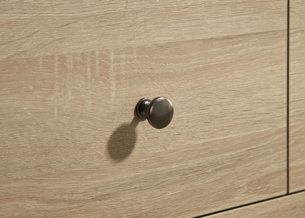 A study in understated elegance, this six-drawer dresser blends modern simplicity with everyday functionality. Its streamlined profile is finished in a soft light oak hue, complemented by antique nickel hardware for a subtle touch of shine. Crafted from engineered wood and finished in a scratch-resistant laminate veneer, it offers durability and beauty in equal measure. Six English dovetail drawers glide effortlessly on metal extension glides for seamless storage. Key Features: • Six-drawer dresser with modern lines and light oak finish for relaxed sophistication • Antique nickel hardware provides a subtle metallic accent to each drawer front • All drawers built with English dovetail joinery for added structure and durability • Smooth-gliding drawers with 35mm full-extension metal glides for daily function • Engineered wood frame wrapped in a scratch-resistant laminate veneer finish • Spacious surface and drawer layout offer functional bedroom clothing storage