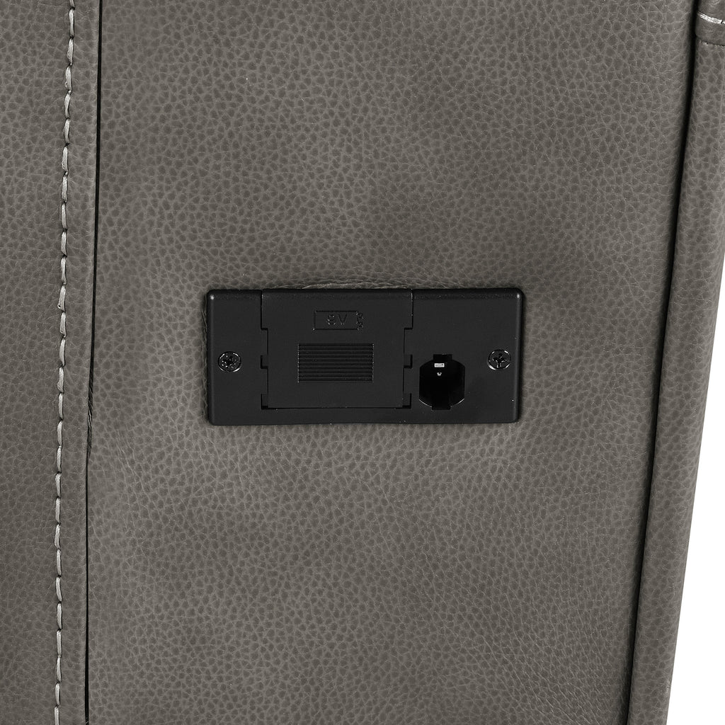 Designed to embrace your every mood, this triple power reclining loveseat transforms quiet evenings into indulgent escapes. Rich leatherette envelopes sculpted cushions, tailored with striking contrast stitching for a refined, modern aesthetic. Effortlessly adjust the power recline, headrest, and lumbar support with an integrated control panel, complete with dual USB ports to keep your devices powered and close. Thoughtfully placed armrest cup holders elevate your lounging experience, while a rear AC access port with emergency battery option ensures seamless operation, no matter the moment. Key Features: • Triple power reclining loveseat with power headrest and power lumbar for total body support • Integrated control panel includes USB A and USB C charging ports plus one-touch home button • Power recline function offers smooth motion with supportive lift from head to lumbar • Armrests conceal stainless steel cup holders for easy-access refreshment • Rear-mounted AC plug-in supports optional 9V battery for power-outage recline reset • Charcoal leatherette upholstery with contrast stitching adds tailored texture and depth