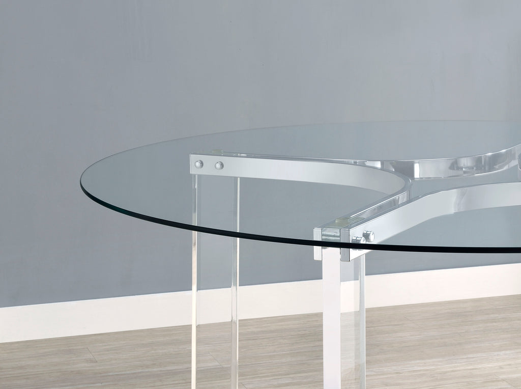 Center your dining experience on a chic, modern round dining table with sculptural appeal. It boasts four straight clear acrylic legs with four-point star bases that create incredible stability. The gleaming chrome finish stands out, adding artistry to your kitchen or dining room. The table is topped with a round of clear glass, adding to its airy ambiance. This contemporary table comfortably seats four, perfect for a breakfast nook or compact dining room. Key Features: • A modern round dining table is crafted for airy lightness perfect for a contemporary dining room • Chrome finish four-point star braces create striking sculptural appeal in a kitchen or dining room • Round tabletop features clear glass that allows artistic structural design to take center stage • Straight, rectangular post legs are made from clear acrylic for a light, airy appearance • Legs feature plastic glides for smooth performance no matter the floor type in your dining space