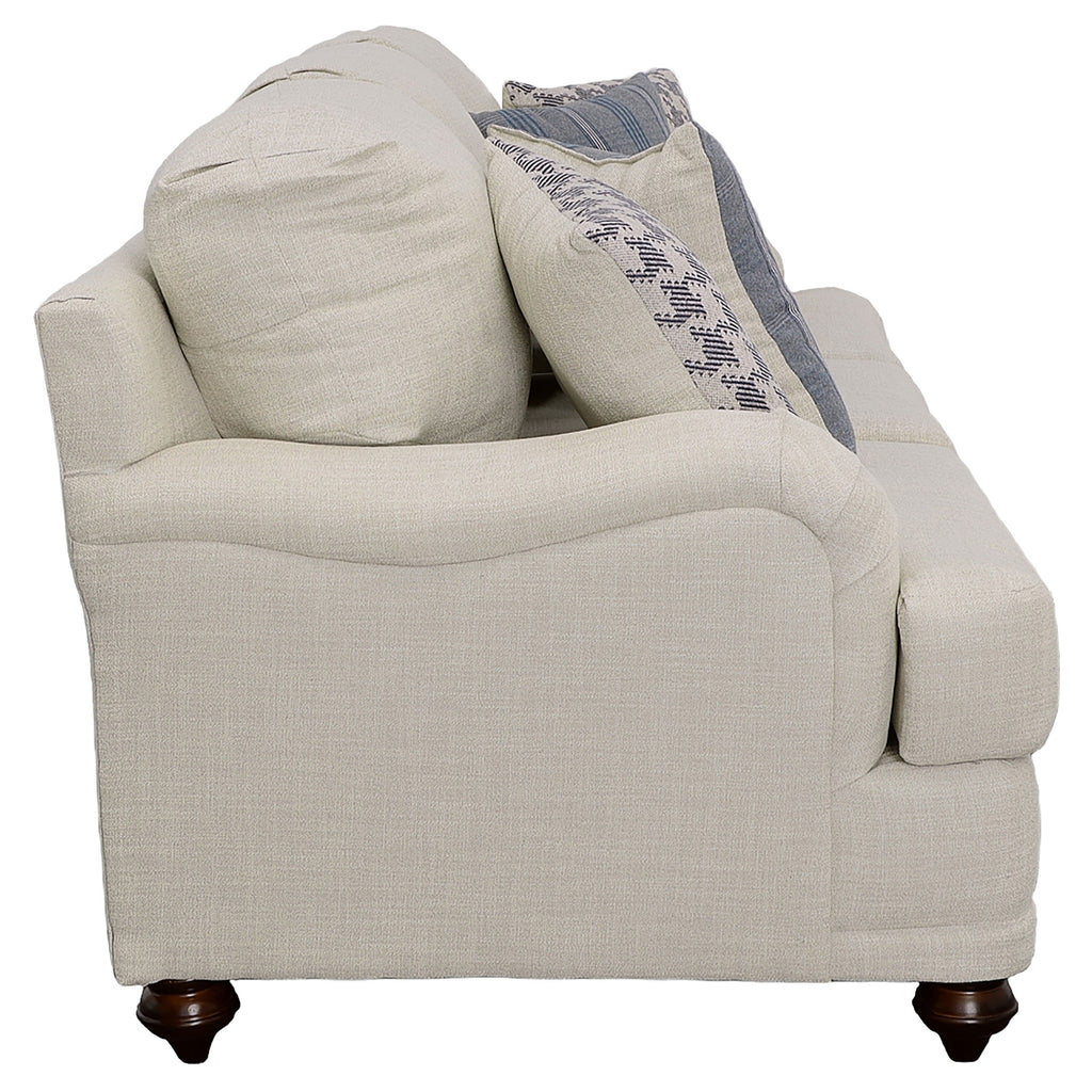 Taking a page from cottage-style farmhouse ambiance, this two-piece sofa and loveseat set wins over family and guests with its elegant simplicity. With tailored English arms and turned legs offering a contrasting espresso finish, each piece of this set shines with a light grey linen-like upholstered cover. Reversible cushions with T-cushions on each end create comfort and stay in shape, as a solid wood frame with a sinuous spring deck sets the stage for durability. Attached back cushions remain stationary to prevent shifting. Enjoy the designer look of seven accent pillows with varying blue print covers. Key Features: • Bring LOVE to your living area with this sophisticated farmhouse collection • Tailored English arms • Turned legs in espresso • No rearranging required with easy to maintain attached back cushions • Extend the life of your upholstery set with reversible seat cushions