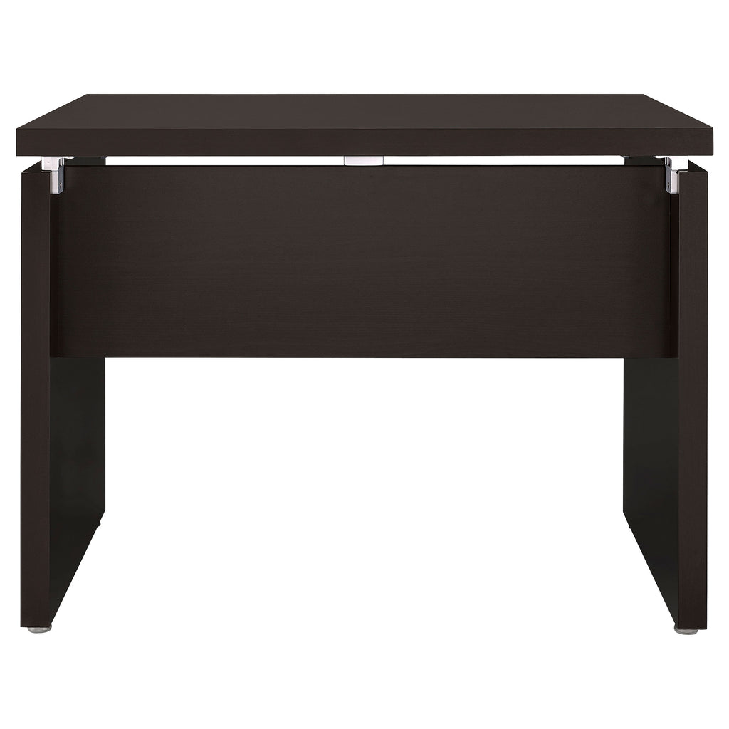 This modern computer desk blends sleek design with practical features for a sophisticated workspace. Constructed from durable engineered wood with a wood-look laminate veneer, it offers both style and functionality. The floating top design adds a contemporary flair, while the keyboard tray provides easy access to essential devices and accessories. Finished in a rich, versatile tone, this desk is perfect for home offices, providing a clean and minimalistic aesthetic with ample work space for your computer, documents, and more. Key Features: • Sleek computer desk with a contemporary floating top design for modern style • Built from engineered wood with a wood-look laminate veneer in a cappuccino finish • Features a convenient pull-out keyboard tray for easy access to your devices • Offers ample workspace for computers, documents, and office supplies • Simple, clean lines make it ideal for both home and office environments • Sturdy construction ensures lasting durability and stability for daily use