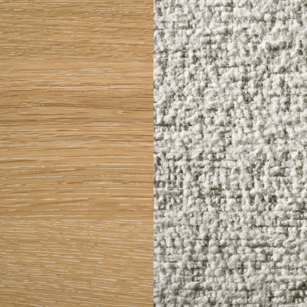 This ladder back dining side chair offers a relaxed blend of rustic character and contemporary ease. Crafted from solid wood in a washed oak finish, it features softly rounded posts and legs that bring warmth without ornate details. The cushioned seat is upholstered in a cozy oatmeal-colored bouclé fabric, providing both textural charm and everyday comfort. Built to support daily use, its clean silhouette and sturdy construction make it a versatile and enduring seating choice. Key Features: • Dining side chair with ladder back design and gently rounded edges for rustic appeal • Washed oak wood finish highlights clean lines with a fresh, modern farmhouse tone • Soft padded seat upholstered in textured oatmeal bouclé for cozy daily comfort • Rounded posts and leg corners soften the frame while enhancing stability • Crafted from solid rubberwood and engineered wood for lasting support • Built to withstand busy family dining with relaxed charm and timeless quality