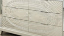 VALLETTA Dresser, 66 1/4"W X 18"D X 40"H, 226.6lbs. Gracing the panels of this dresser is an intricate play of radial and circular lines, engraved in polyresin material. Your eyes are drawn towards this beautiful pattern reminiscent of the art deco era. Mirror panels line each front edge, adding to the luxurious appeal. On top of that, the classy champagne finish exudes subtle warmth that makes this dresser, even in its grandeur, still plenty welcoming.