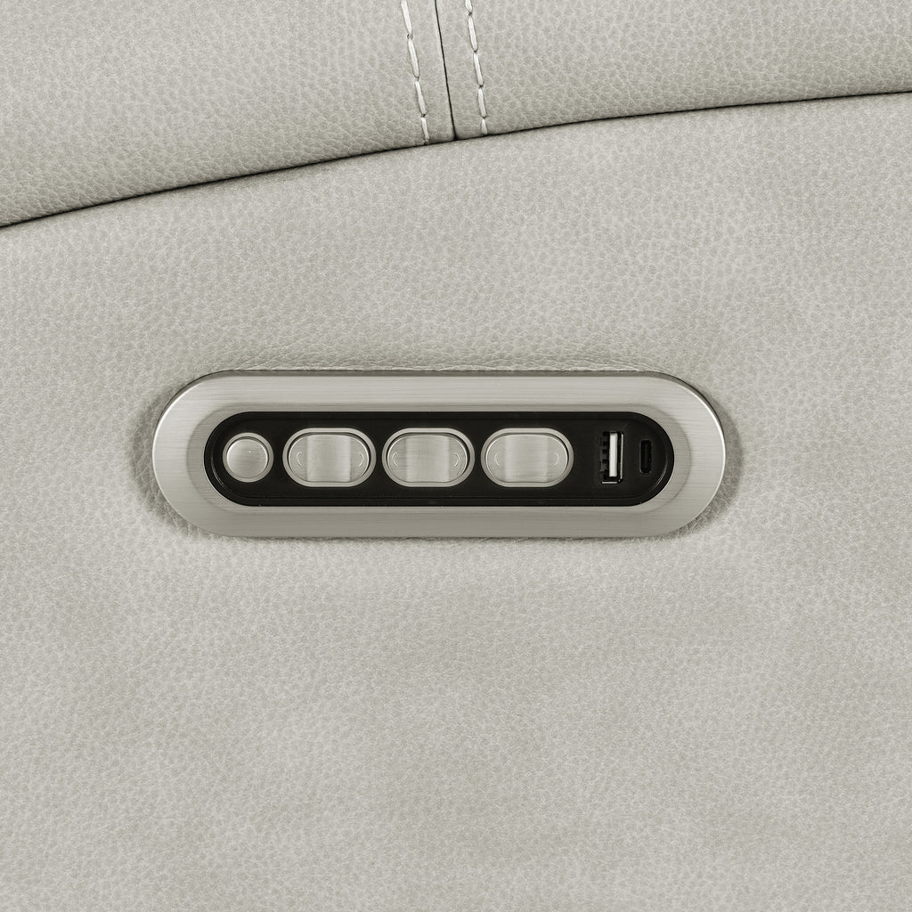 This triple power recliner chair invites you to unwind with motion, support, and quiet luxury. Wrapped in soft leatherette upholstery, it offers a supple touch that enhances every moment of rest. A gliding and swivel base flows effortlessly while plush cushions and contouring lumbar support cradle the body. Power headrest, lumbar, and recline functions adjust at your command. Hidden cup holders and built-in USB A and USB C ports add thoughtful convenience, while an emergency power-down port offers peace of mind. Key Features: • Triple power recliner chair with glider and swivel functions delivers motion-based comfort • Charcoal leatherette finish pairs with clean lines and deep channel-stitched back cushions • Power recline, headrest, and lumbar adjust easily with ergonomic control panel • USB A and USB C ports built into the panel for effortless device charging • Armrests conceal stainless steel cup holders for discreet beverage storage • Emergency power-down battery port provides added function during power outages